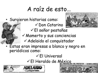 Este documento describe los cómics, incluyendo su historia, elementos, temas y tramas comunes. Explica que los cómics narran historias a través de ilustraciones y textos y surgieron en el siglo XIX. También describe elementos como viñetas, globos y onomatopeyas, así como temas populares como aventuras, ciencia ficción y superhéroes. Finalmente, resume la historia de los cómics en México desde la década de 1920 hasta la actualidad.