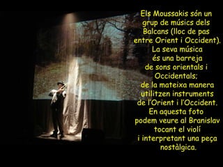 Els Moussakis sónun grup de músics dels Balcans (lloc de pas entre Orient i Occident). La seva música és una barreja de sons orientals i Occidentals; de la mateixa manera utilitzen instruments de l’Orient i l’Occident. En aquesta foto podem veure al Branislav tocant el violí i interpretant una peça nostàlgica.