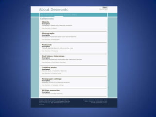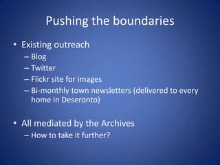 The document outlines various outreach experiments conducted by Amanda Hill at Hillbraith Ltd. for Deseronto Archives, including initiatives like a new website and social media engagement to enhance community interaction. Despite some challenges with user participation and technology, there were successful outcomes such as oral history interviews and increased visits to the archives. Overall, the outreach efforts emphasized the need for diverse strategies and ongoing experimentation in engaging the community.