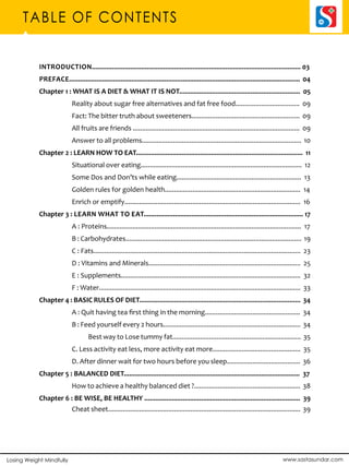The document emphasizes that losing weight should focus on mindful eating and understanding personal dietary needs rather than extreme diets or starvation. It advocates for a balanced diet that includes all food groups in moderation while avoiding processed food alternatives that are marketed as 'diet' or 'fat-free.' Ultimately, the goal is to foster a healthy relationship with food, making sustainable changes that enhance overall well-being and happiness.