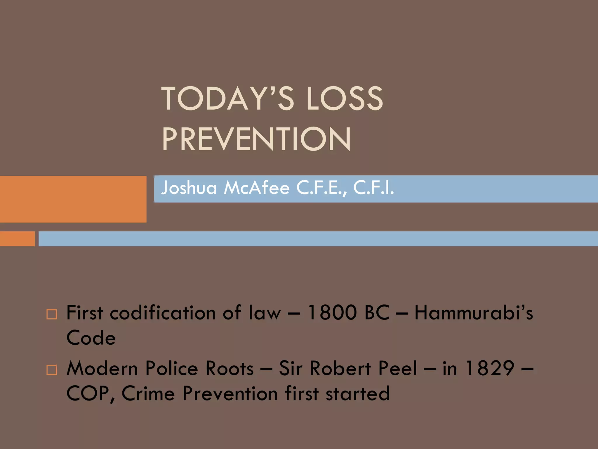 This document provides a historical overview of loss prevention and summarizes key loss prevention tools and strategies. It discusses the evolution of modern policing and loss prevention from 1800 BC laws to the modern roles of crime prevention officers and loss prevention officers. The core loss prevention tools are identified as risk analysis, planning, evaluation, research, and standards. Crime prevention strategies like CPTED focus on natural surveillance, access control, and barriers to reduce opportunities for crime. Risk management techniques include risk avoidance, transfer, abatement, and acceptance. Internal threats are addressed through controls, auditing, policies and physical security.