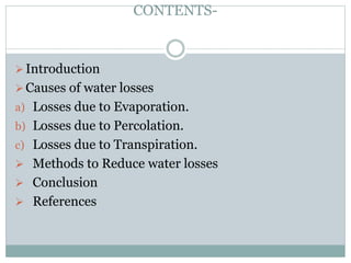 The document discusses water losses that occur in canals due to evaporation, percolation, and transpiration. It identifies the key causes of water losses for each category, such as temperature, soil permeability, and vegetation growth. Methods to reduce losses, such as efficient field irrigation practices and canal management, are also presented. In conclusion, transit water losses from the canal head to the fields are defined, and the three main causes and approaches to lower losses are recapped.