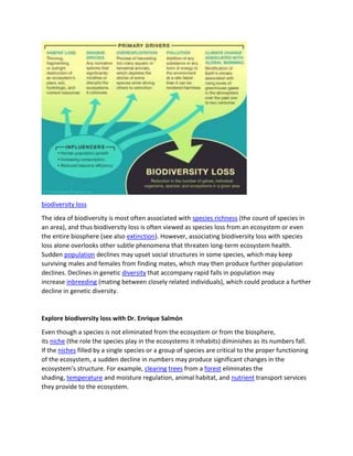 The document discusses biodiversity loss and its causes and effects. It notes that biodiversity loss refers to the decline in genetic and species diversity within ecosystems and is currently occurring at rates 100 to 10,000 times higher than background extinction rates, threatening up to one million species. The primary drivers are habitat loss, invasive species, overexploitation, pollution, and climate change, exacerbated by human population growth. Biodiversity loss reduces ecosystem services, resilience, and complexity, threatening ecological collapse. Solutions require addressing the underlying causes through conservation policies, sustainable practices, and protection of biodiversity hotspots.