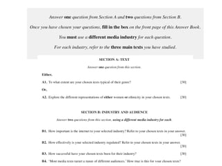 The document discusses various topics related to analyzing media texts for an exam, including film, television, music, genres, representations, industries, and audiences. It provides example exam questions, notes on the TV show Lost, and discusses conventions of Lost that appeal to broad audiences. Specifically, it notes Lost uses an ensemble cast representing different groups, is set in a neutral island location, blends genres, uses enigma codes to engage audiences, and incorporates a score to elicit emotions.