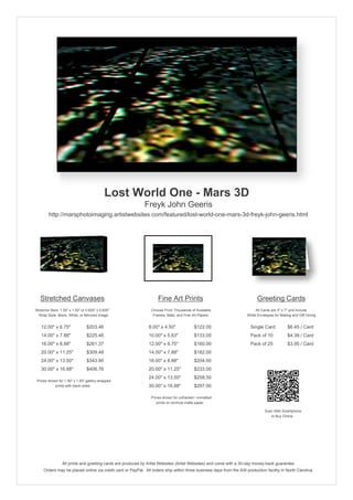This document provides pricing information for purchasing artwork from the artist Freyk John Geeris. It lists the sizes and prices for stretched canvases, fine art prints, and greeting cards of the artist's work titled "Lost World One - Mars 3D". Stretched canvases are available in various sizes from 12x6.75 inches to 30x16.88 inches and range in price from $203 to $406. Fine art prints come unframed and unmatted on archival paper in sizes from 8x4.5 inches to 30x16.88 inches, costing between $122 and $297. Greeting cards featuring the artwork are $6.45 each, or $4.39 for a