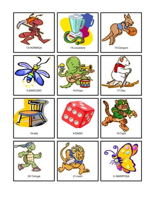 The document contains a list of 42 Spanish words arranged in rows of 3 words each. The words include names of animals, fruits, vegetables, and objects.