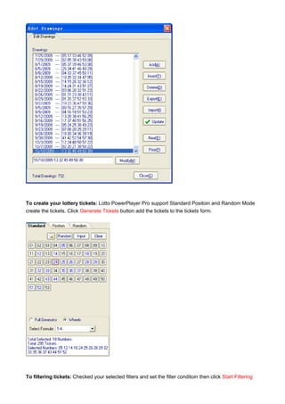 Lotto PowerPlayer Pro is a comprehensive lottery tool designed to assist users in analyzing previous lottery drawings and generating tickets using various filtering and wheeling systems. The software supports over 100 lotteries across more than 18 countries and offers features including ticket generation, filtering options, and ticket management functionalities. Users can customize their lottery tickets, check for winning numbers, and utilize statistical analysis to enhance their gaming strategy.