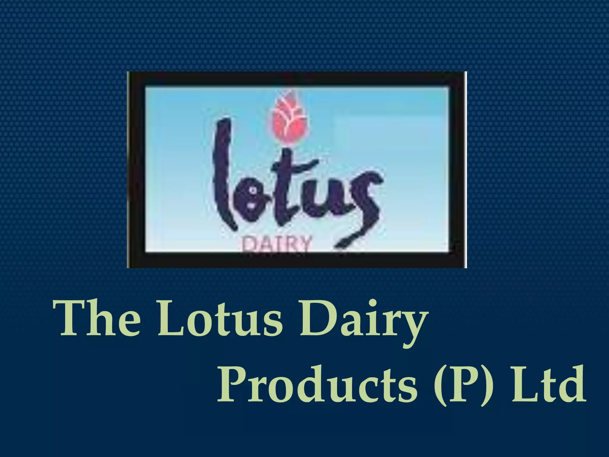 The Lotus Dairy Products (P) Ltd is the fastest growing private sector dairy in Rajasthan, with a current processing capacity of 100,000 liters per day. It has over 30 years of experience in the dairy industry and is managed by skilled dairy professionals. Lotus aims to be the second most popular brand in the state's dairy industry. It procures over 7 million liters of milk per day, 1 million of which comes from its Bassi plant. Within 6 years, Lotus has become the largest private dairy company in Rajasthan, capturing an 18% market share. It plans to expand into new products and markets while maintaining strict quality control.