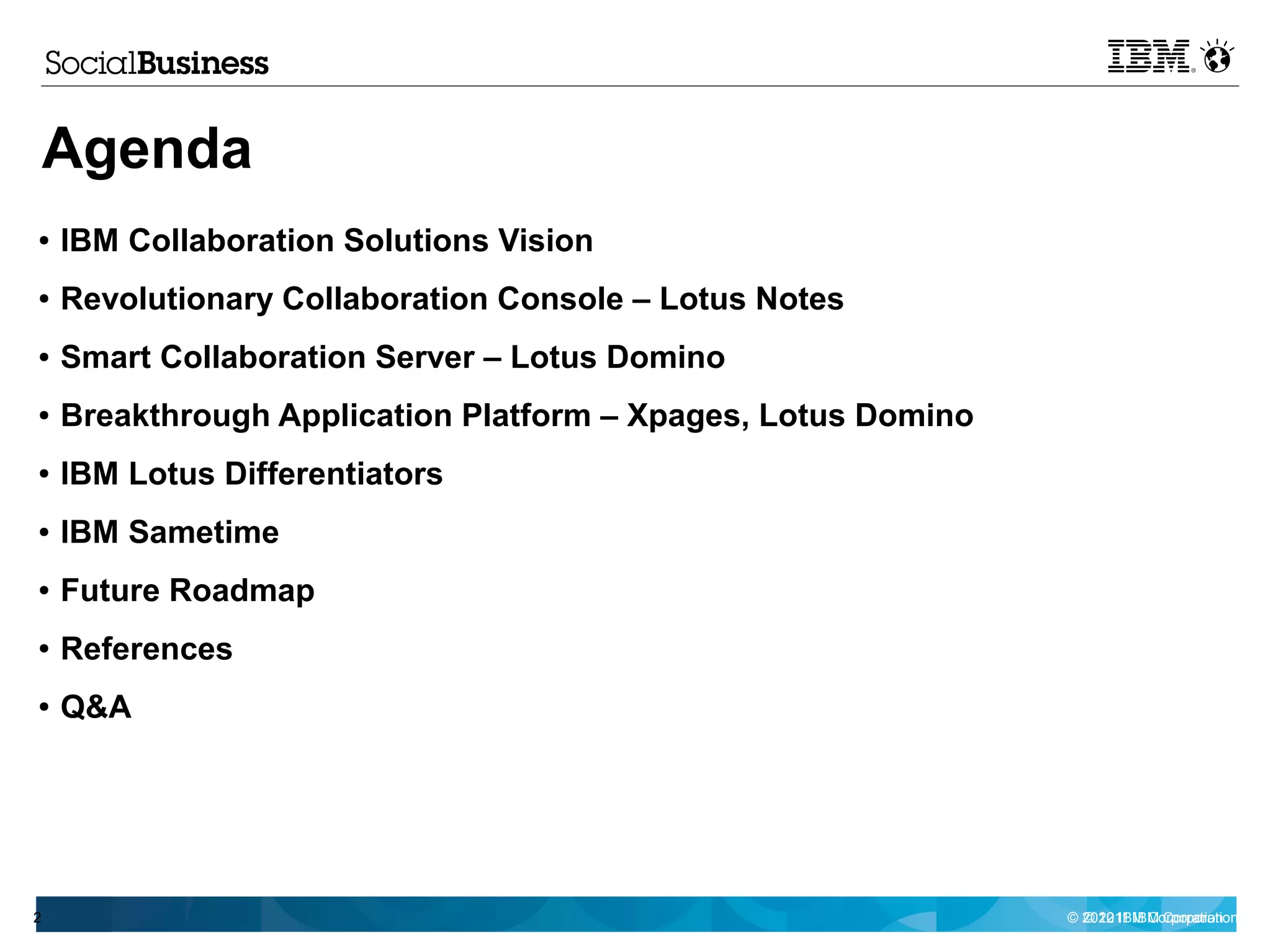 IBM's collaboration solutions, including Lotus Notes and Domino, aim to enhance messaging, social interaction, and application integration, enabling a more efficient work experience. The software promotes various features such as instant messaging, calendar integration, document sharing, and offline productivity, all while ensuring security and administration efficacy. Future developments are focused on enhancing user experiences through social capabilities and hybrid cloud accessibility.
