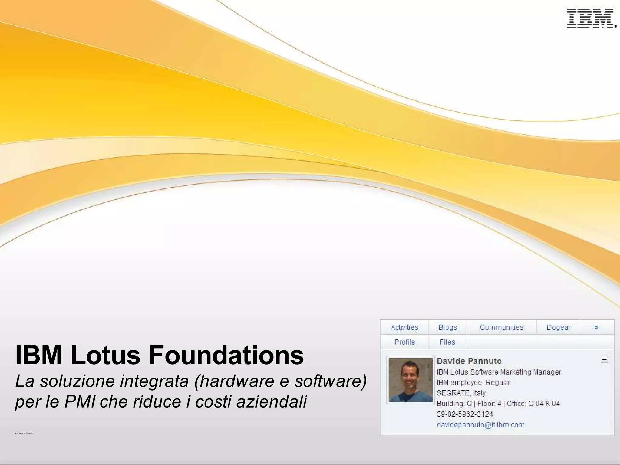 IBM Lotus Foundations è una soluzione integrata hardware e software per le PMI, progettata per ridurre i costi e semplificare la gestione IT. Consente installazioni e configurazioni automatiche, con supporto remoto e aggiornamenti facili, senza necessità di intervento fisico. La piattaforma offre un ambiente completo per una gestione efficiente delle applicazioni, backup e sicurezza, supportando anche applicazioni aggiuntive.