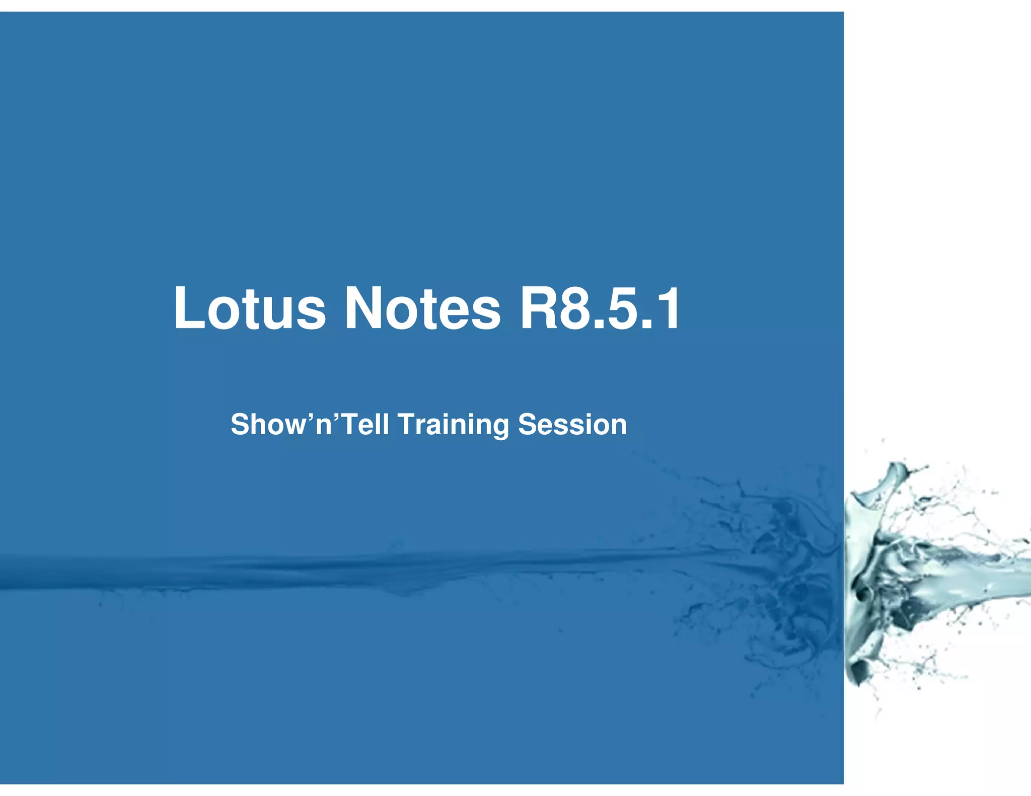 The Lotus Notes R8.5.1 training session overview outlines the presentation structure, including an introduction by expert developers and discussions on key features of the software. The topics covered include the bookmark bar, unified preferences, Sametime client, tabbed chat, toolbars, and improved search functionalities. The session aims to provide tips and tricks to enhance user experience with the software's new features.