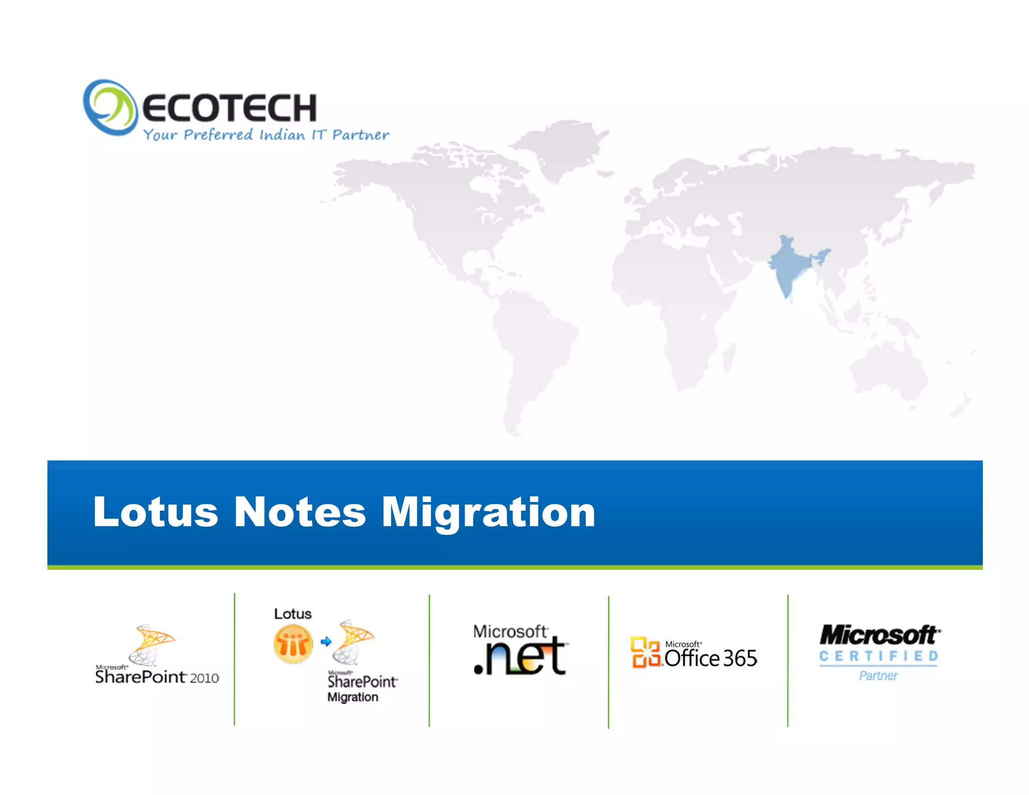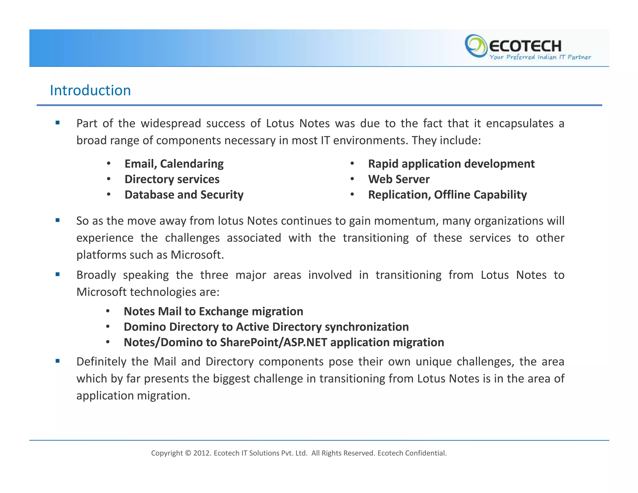 The document discusses the challenges organizations face while migrating from Lotus Notes to Microsoft technologies, focusing on email, directory, and application transitions. It highlights the importance of professional services in planning and executing migrations due to complexities involved. Additionally, it outlines the migration process, necessary considerations, and available tools for a successful transition.