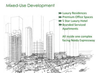 Lotus Square is a mixed-use development located in Sector 98 Noida Expressway that will include luxury residences, premium office spaces, a 5-star luxury hotel, and branded serviced apartments. The project is strategically located near other high-end commercial and residential developments like Lotus 300, Lotus Peak, One Hamlet, and UGCC, and is close to reputed schools and hospitals. It will feature state-of-the-art amenities like a clubhouse, concierge services, security, and green building practices.