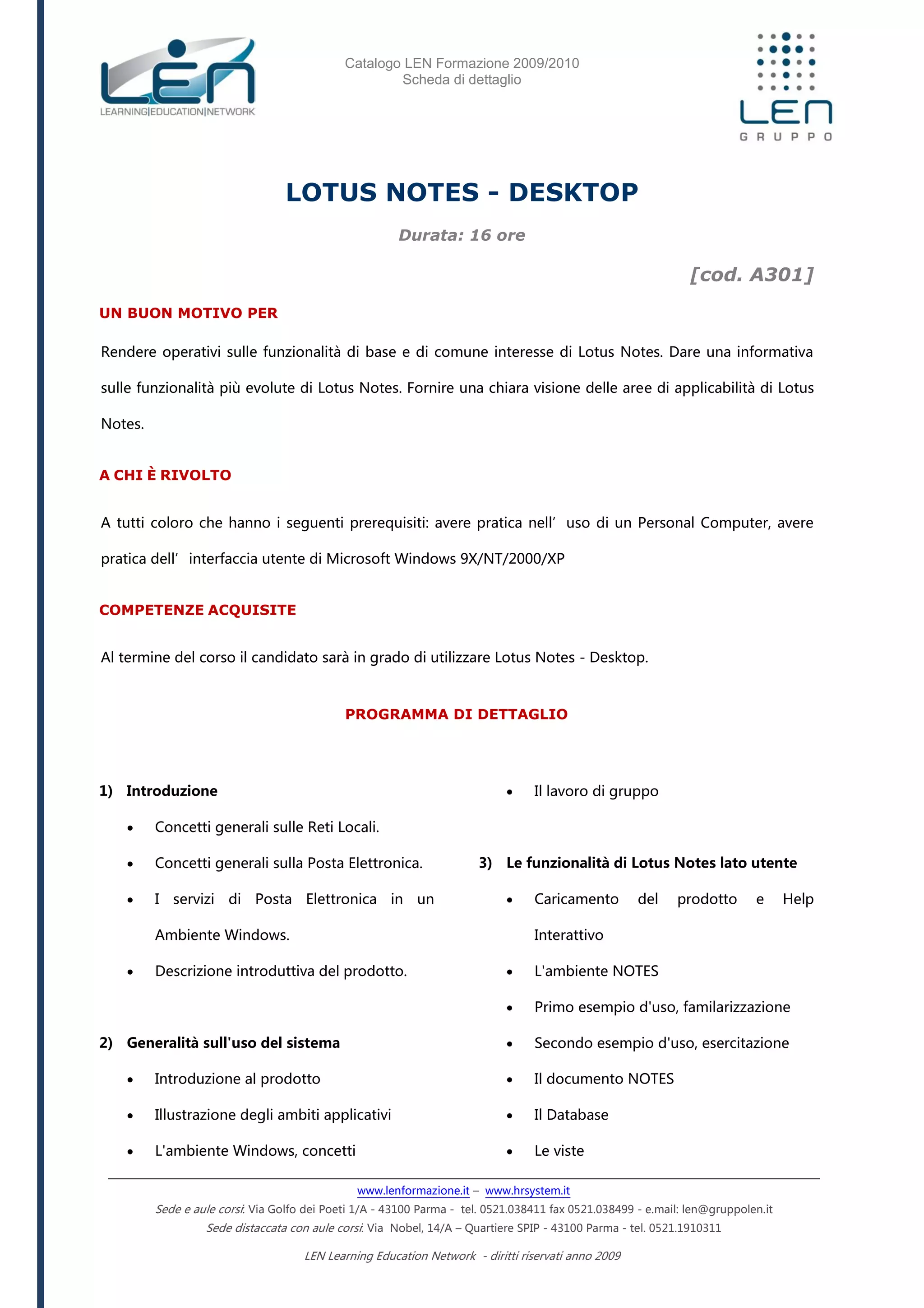 Il documento descrive il catalogo della formazione LEN per l'anno 2009/2010, focalizzandosi su un corso di 16 ore su Lotus Notes - Desktop. È destinato a chi ha familiarità con i computer e Microsoft Windows, e al termine del corso i partecipanti saranno in grado di utilizzare Lotus Notes per vari scopi. Vengono illustrati gli obiettivi del corso, le nozioni fondamentali e le modalità formative disponibili.