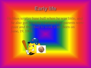 The document discusses a man who enjoyed playing baseball as a child and went on to join the New York Yankees in 1923 at age 20. He broke Babe Ruth's single-season home run record of 60 home runs and held the record until it was broken by Cal Ripken Jr. The document also states he died of a disease and was viewed as a hero who encouraged children to follow their dreams.