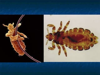 Lice are small parasitic insects that feed on the skin and blood of birds and mammals. There are over 3,000 species of lice that affect different animal hosts. Lice that feed on blood are called sucking lice, while those that feed on skin and debris are called chewing lice. Horses can be affected by two common species - the chewing louse Bovicola equi, which feeds on skin and hair, and the sucking louse Haematopinus asini, which feeds on blood. Heavy lice infestations can cause skin irritation and weight loss in horses. Treatment involves proper grooming, nutrition, and application of insecticides.