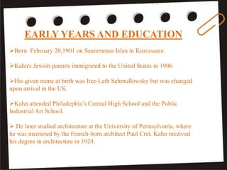 Louis I Kahn was an influential American architect born in 1901 in Estonia. He is known for his monumental and monolithic modern designs that emphasized the materials and structure of buildings. Some of his most notable works include the Salk Institute, Yale Center for British Art, and buildings at the Indian Institute of Management. Kahn designed buildings with bold geometry, parallel and perpendicular lines that had a futuristic style. He was awarded several honors in his career before passing away in 1974 while traveling to India.