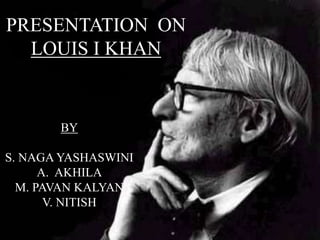 Louis I Kahn was an American architect known for his monumental and monumental buildings. Some of his most notable works include the National Assembly Building in Bangladesh, the Indian Institute of Management in Ahmedabad, India, and the Kimbell Art Museum in Fort Worth, Texas. Kahn's buildings are characterized by their use of simple materials like brick and concrete and their emphasis on natural light and the interplay of solid and void. He strove to create a sense of spirituality and awe through his designs.