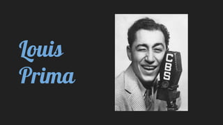 Louis Prima was an American singer, actor, and bandleader known for his energetic big band jazz style. He got his start in the 1920s playing in New Orleans jazz bands and later led his own band, known as the Witnesses, which had huge popularity in the 1950s and 1960s performing in Las Vegas. Some of his most famous songs included "Sing, Sing, Sing," "Jump, Jive an' Wail," and collaborations with singer Keely Smith who was his vocal partner and wife during their time as headliners in Las Vegas.