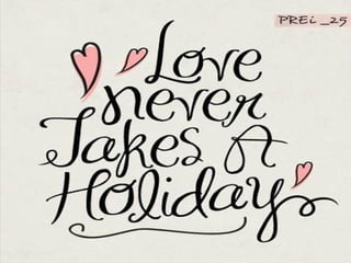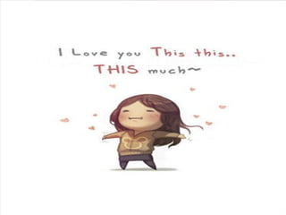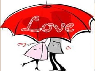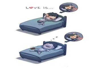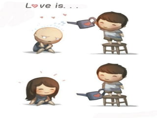 Love can take many forms, from passionate romantic love to familial love. There are several types of love identified in ancient Greek - eros (passionate love), philia (friendship), agape (unconditional love), storge (familial love), and mania (obsessive love). Being in love is expressed through body language like making eye contact, smiling, leaning toward the other person, and constantly thinking about them. However, love can also be weakened by behaviors like misbehaving, ignoring, lying, breaking promises, avoiding contact, and doubting the other person. Different kinds of couples can also exist, such as romantic couples who plan things for each other, playful couples who joke around,