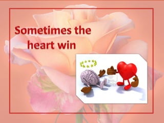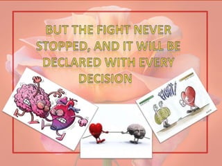 The document discusses the dynamic relationship between the heart and the brain, depicting them as essential and contrasting leaders of human emotions and decision-making. The brain is characterized as logical and cautious, while the heart is seen as passionate and impulsive, resulting in a conflict that is necessary for balance in life. Ultimately, it emphasizes the importance of harmonizing the two to navigate life's challenges effectively.