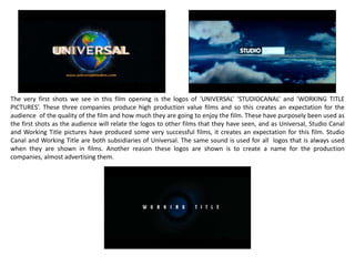 The document provides a summary of the opening scenes and title sequence of the film "Love Actually". It describes the production company logos that are shown at the beginning to establish expectations of quality. It then discusses a montage showing different people hugging and kissing at an airport, accompanied by slow music. A voiceover identifies the location as an airport arrival gate. Throughout the montage, different shots are used to show facial expressions. As the voiceover ends, the words "love actually is all around" appear on screen, revealing the title of the film. The music fades out as the title displays against a black background before fading into the next scene of an older male character in a recording studio.
