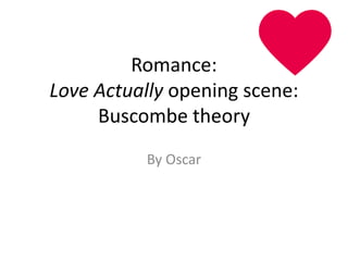 The opening scene of Love Actually takes place at Heathrow Airport in London. It introduces several couples being reunited after long periods apart. Smiles and warm lighting establish the romantic genre. Luggage, sunglasses, and souvenirs signify travel and returning home. A kissing couple leaves no doubt this is a romance film. Soft, calming instrumental music focuses viewers on the scene. The ending mirrors the beginning, with departures and returns, reflecting the theme of people constantly moving in and out of relationships over the course of one's life.