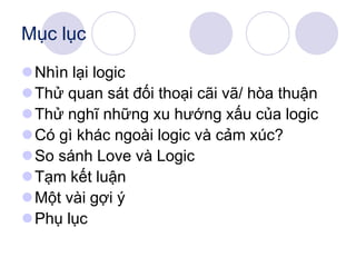 Tài liệu bàn về vai trò của logic và tình thương trong cuộc sống, nhấn mạnh rằng mặc dù logic là cần thiết cho quyết định và giải quyết vấn đề, tình thương là yếu tố quan trọng kết nối con người và đem lại hạnh phúc. Nó chỉ ra rằng cả hai đều tồn tại đồng thời trong mỗi người, nhưng tình thương vượt lên trên các khái niệm đúng/sai và tốt/xấu. Cuối cùng, tài liệu khuyến nghị phát triển tư duy tích cực để cân bằng giữa logic và tình thương.