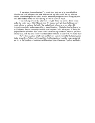Gabriella is a princess who lives in a palace in Paris, France. She first sees a man named Matt writing by a lake and is instantly smitten. They officially meet when Gabriella trips and Matt helps her up. They go for coffee and really hit it off. However, Gabriella's father does not approve of Matt because he is not royal. Matt vows to win her father's approval. He leaves for months to battle the Prince of the kingdom of Cantaloupe for the throne. Gabriella worries for Matt but he returns victorious. Her father finally allows them to be together. Years later, Matt proposes to Gabriella on the Eiffel Tower and they have