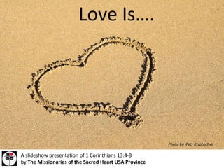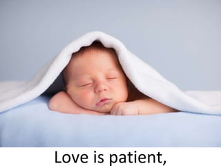 The document is a slideshow presentation summarizing key aspects of love according to 1 Corinthians 13:4-8. It describes love as being patient, kind, not jealous, or pompous. Additionally, love is not rude, seeks others' interests over its own, is not quick-tempered, does not brood over injury or rejoice in wrongdoing. Love bears all things, believes all things, hopes all things, and endures all things. The slideshow includes various stock photos to illustrate aspects of love.