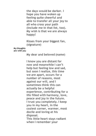 The document is a collection of loving letters from one person to another expressing deep feelings of affection, longing, and commitment to their relationship. The letters discuss waking up thinking of the other, bringing each other joy and hope, getting through difficult times together by learning from the past, and feeling complete with the other's love and company. Kisses and terms of endearment are used throughout.