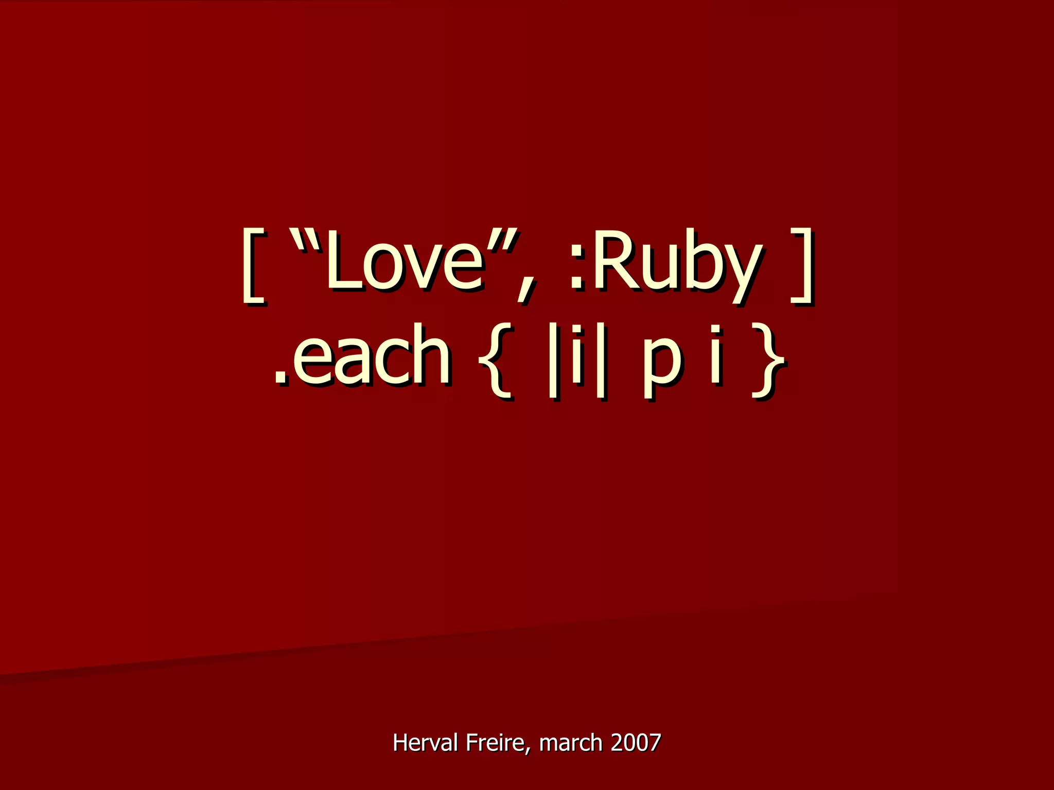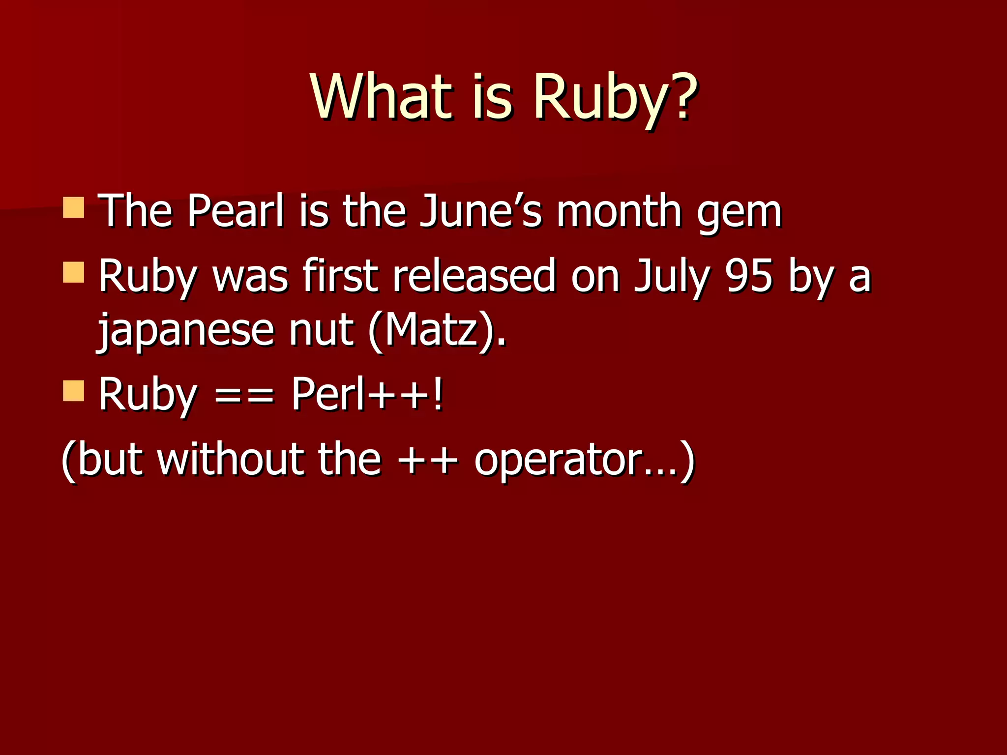 Ruby is a dynamic, object-oriented programming language that was created in 1995 and features implicit typing, duck typing, and powerful blocks. It has conventions like snake_case and uses symbols extensively. Ruby code is concise yet flexible and integrates well with Java through implementations like JRuby.