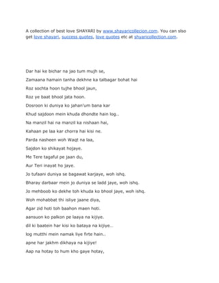 The document offers a collection of love shayari that express deep emotions and romantic sentiments. It showcases various themes of love, longing, and connection, illustrating the complexities and beauty of relationships. The verses emphasize the significance of love and personal bonds, often intertwining pain with joy.