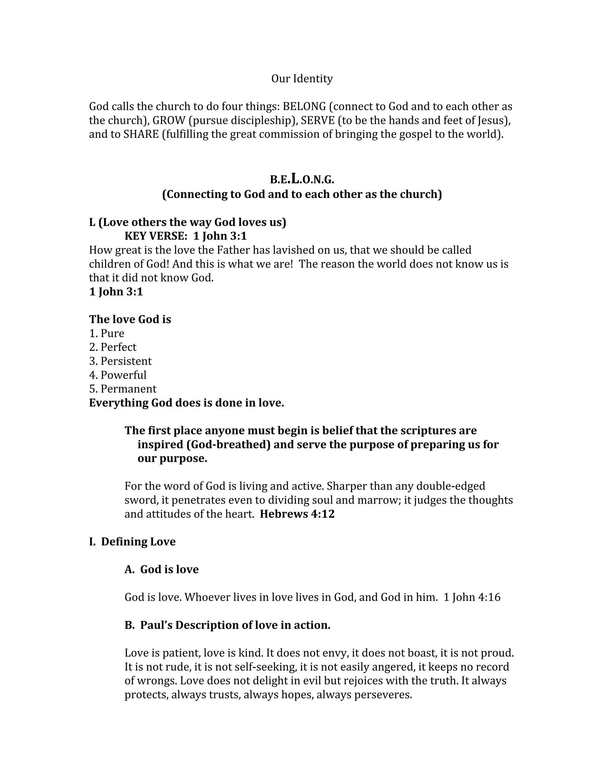 God calls the church to belong (connect with God and each other), grow (pursue discipleship), serve (be like Jesus), and share (spread the gospel). The document discusses belonging in depth, defining love as God's love for humanity. God's love is perfect, powerful, permanent and a gift demonstrated through Jesus. The church is called to show this same selfless, sacrificial love to others.