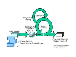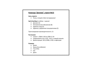 Документ описывает методологию Scrum, акцентируя внимание на ключевых ролях, таких как Product Owner, Scrum Master и команда разработчиков. Представлены основные практики, такие как планирование спринтов, ежедневные встречи и ретроспективы, а также преимущества и проблемы, связанные с этой методологией. Рассматриваются инструменты для управления проектами и способы улучшения коммуникации в командах.