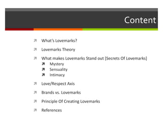 This document discusses the concept of Lovemarks, which are brands that inspire passion and devotion beyond reason. Lovemarks have secrets that make them stand out, including mystery, sensuality, and intimacy. The Lovemarks theory is that emotions lead to action, rather than reason leading to conclusions. To create a Lovemark, brands must focus on relationships rather than just information, and tell passionate stories that create love and wrap the brand in mystery. Principles for creating Lovemarks include being passionate about the brand, involving customers, telling great stories, and accepting responsibility.