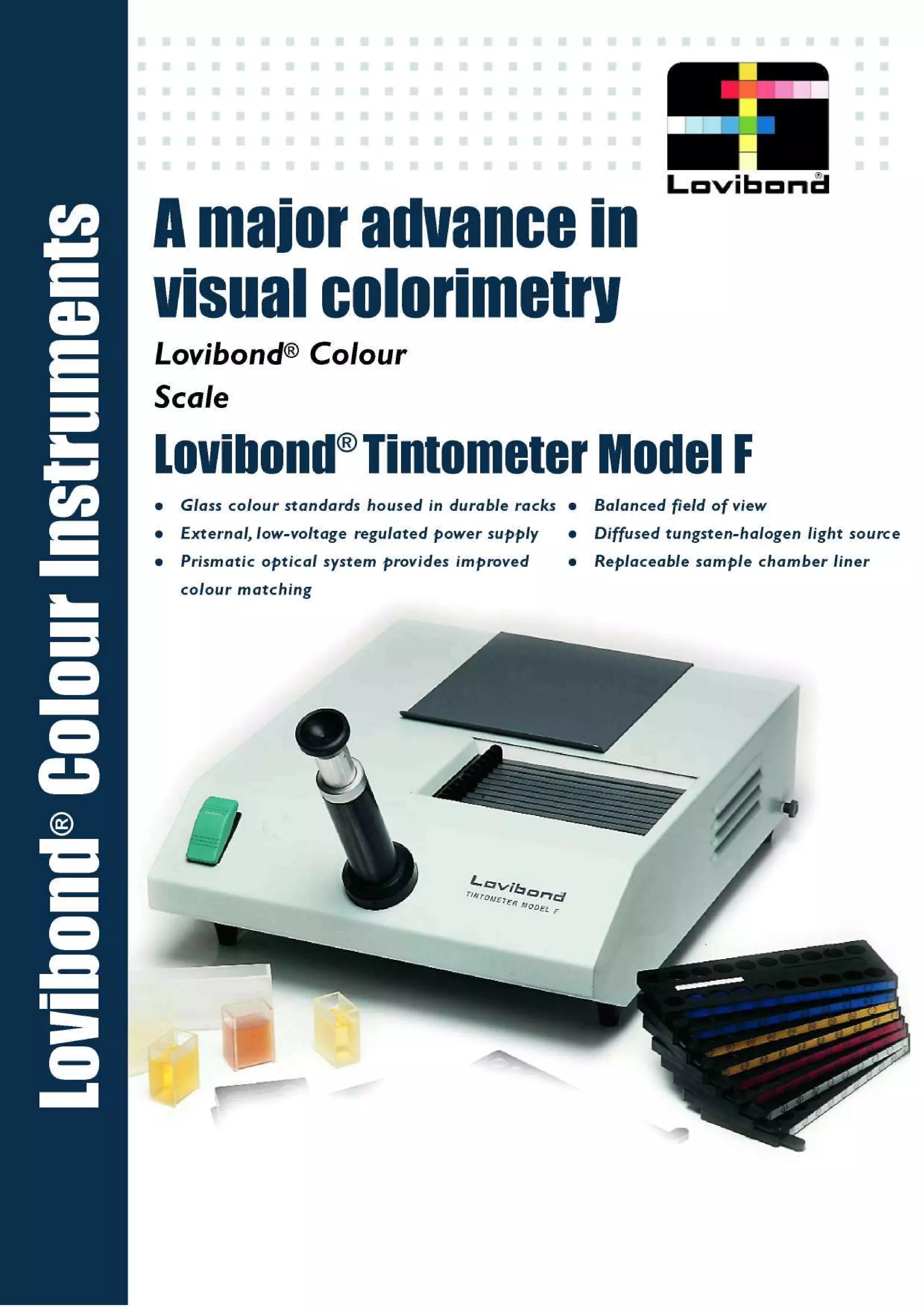 The Lovibond Tintometer Model F is a visual colorimeter that allows users to compare the color of light transmitted through or reflected from a sample to the color transmitted through a series of Lovibond glass filters. By varying the glass filters in sliding racks placed in the comparison field until a visual color match is found between the sample field and comparison field, the color can be expressed in Lovibond units. The Model F is designed for easy cleaning and maintenance to maintain accuracy even in harsh operating conditions, with replaceable sample chamber liners and ability to replace individual glass filters. It is available in different formats to meet standards for measuring colors of various materials like fats, oils, chemicals, and more.