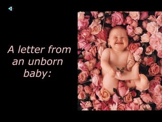 An unborn baby writes a letter to its mother over several months of development in the womb, expressing happiness at being conceived and growing. The baby senses the mother's increasing sadness and confusion over why the parents argue. At three months, the mother visits the doctor and schedules an appointment, worrying the baby. The next day, the baby experiences pain and fear as it is forcibly removed from the womb during an abortion procedure, crying out for help until it can no longer continue. Seventeen years later, the mother still suffers over her decision. The document advocates against abortion and shares the story behind a famous photo capturing a baby's hand holding a surgeon's finger in the womb.