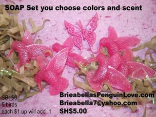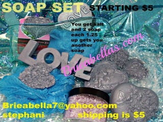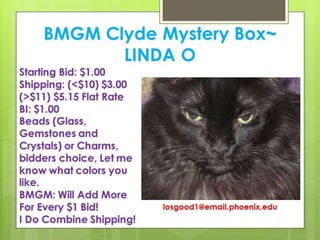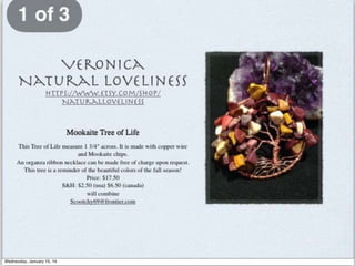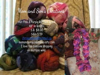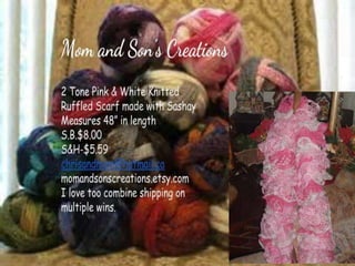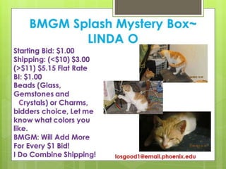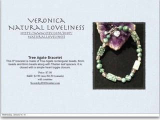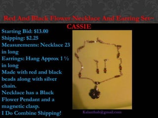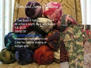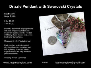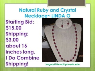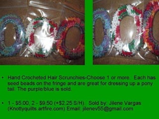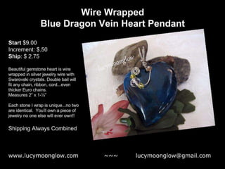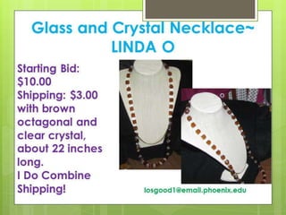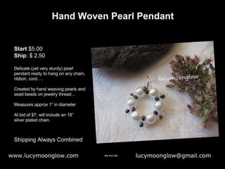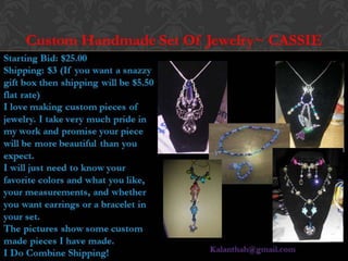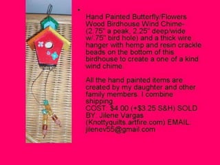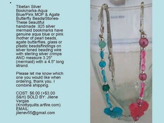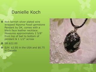The document is a list of handmade and unique products available for auction, including jewelry, decorative items, and art supplies, along with their corresponding prices and shipping information. Items range from silver wire wrapped gemstone pendants and handmade dollhouses to goat milk soaps and crochet accessories, each crafted by different artisans. The auction details indicate starting bids, shipping costs, and contact information for sellers, promoting a variety of crafts and gifts.