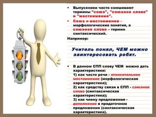 Документ рассматривает сложности, с которыми сталкиваются выпускники при изучении русского языка, в частности, различие между терминами 'союз', 'союзное слово' и 'местоимение'. Он также подробно объясняет морфологические и синтаксические особенности этих понятий, включая правильное употребление союзов, мест и чисел. Включены примеры и советы по грамматике, которые помогут уяснить правила русского языка.