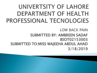 The document provides a comprehensive overview of low back pain (LBP), highlighting its prevalence, causes, risk factors, and the classification of pain as acute, subacute, or chronic. It discusses various diagnostic methods and treatment options, including conventional therapies and occupational interventions aimed at prevention and management. The importance of lifestyle modifications, proper body mechanics, and ergonomic considerations for reducing the risk of LBP is also emphasized.