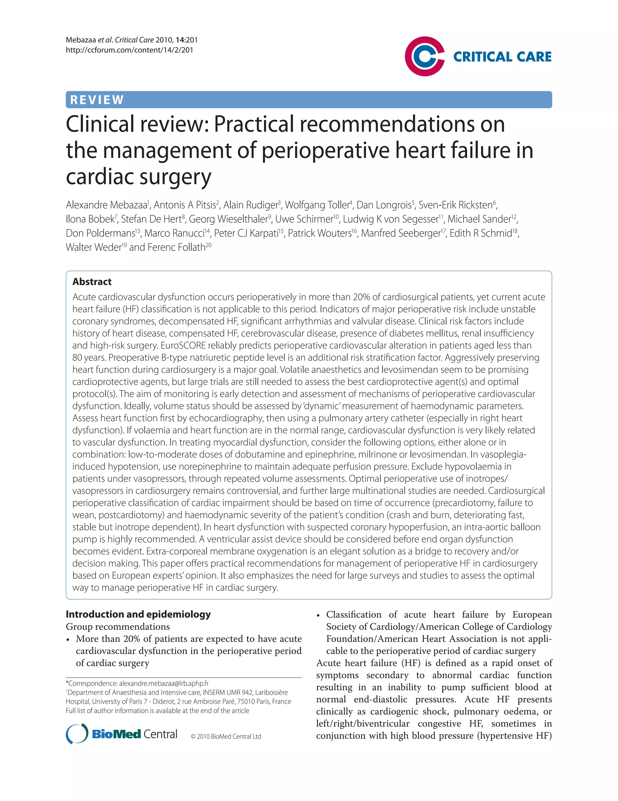 The document provides practical recommendations for managing perioperative heart failure in cardiac surgery, emphasizing that over 20% of patients may experience acute cardiovascular dysfunction during this period. Key indicators of risk include unstable coronary syndromes and decompensated heart failure, while the Euroscore is highlighted as a reliable predictor for patients under 80. The need for further large-scale studies to optimize treatment strategies and cardioprotective agents is also underscored.