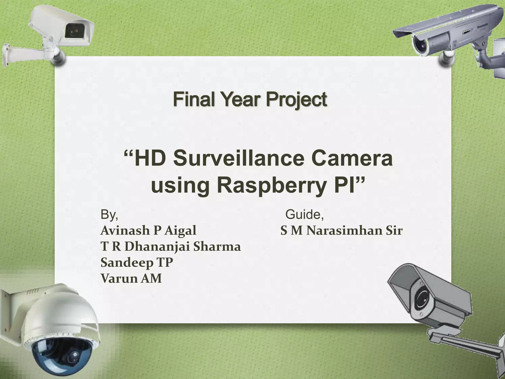 This document describes how to build an HD surveillance camera system using a Raspberry Pi. The system uses a Raspberry Pi, camera module, WiFi adapter, housing, power supply, SD card, and motion detection software. The Raspberry Pi runs Raspbian OS and uses the camera module, motion software, and WiFi to detect and record motion events to the SD card. The live video stream and recorded videos can be accessed from any browser using the Raspberry Pi's static IP address.