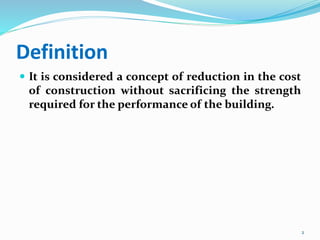 This document discusses concepts and methods related to low-cost housing. It defines low-cost housing as reducing construction costs without compromising building strength or performance. Common methods discussed for reducing costs include using locally available materials, traditional construction techniques, reducing plinth heights and wall thicknesses, and decreasing architectural features. However, the document notes that reducing costs by sacrificing quality, durability or maintainability is a misconception. True economy is achieved through efficient management of resources and adopting high-quality, locally-appropriate designs and materials.