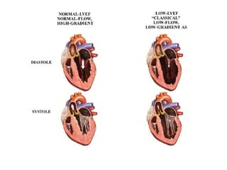 2. Evaluation of low flow AS involves calculating aortic valve area using continuity equation in addition to gradients, as well as tests like dobutamine stress echocardiogram, CT calcium scoring, and novel markers of left ventricular function.