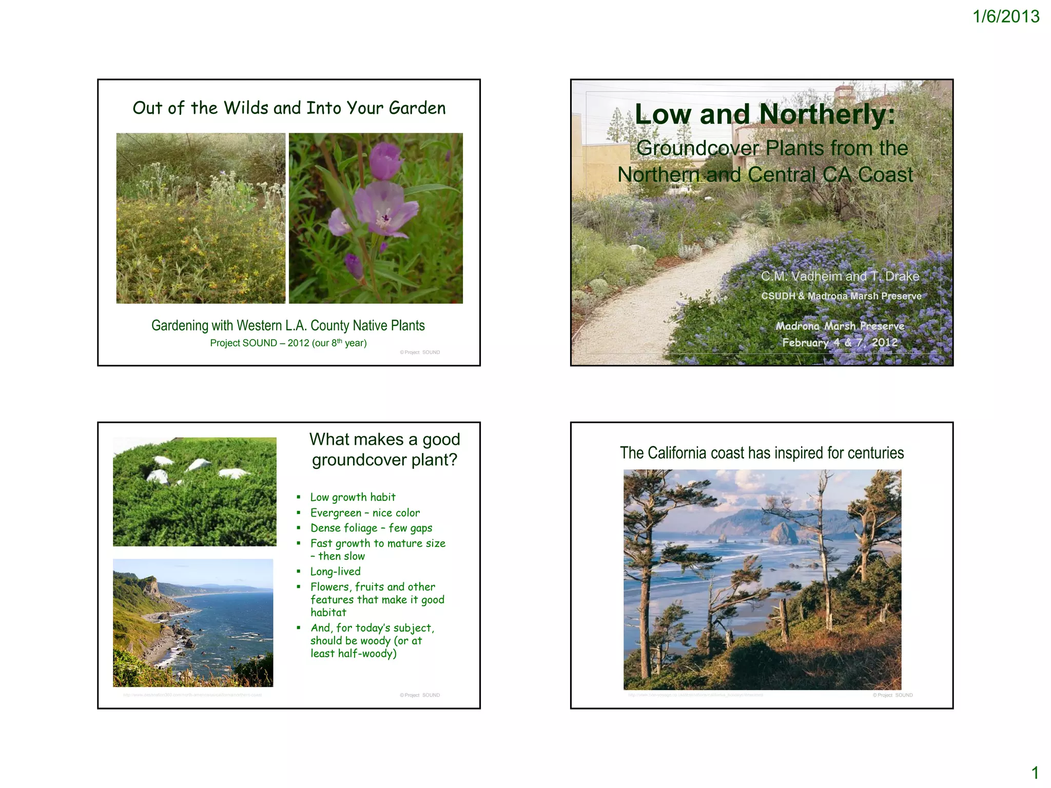 This document provides information about groundcover plants native to the northern and central California coast. It begins with an overview of the climate and plant communities of the central and northern maritime chaparral zones. It then describes a road trip along Highway 1, highlighting plant species and conditions at various locations including Point Sal, Hearst Castle, the Arroyo de la Cruz region. Several manzanita species native to the region are discussed in depth, including their growth habits, cultivation needs, and variability. The document emphasizes how plants from nearby coastal areas are well-suited for gardens due to similarities in climate and soil conditions.