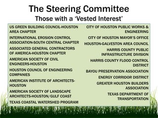 This document describes the Houston Land/Water Sustainability Forum, which brings together organizations interested in sustainable land and water use. It held a design competition to promote low-impact development techniques. The competition had categories for green roadway design, urban redevelopment, and suburban residential development. It attracted many design firms and professionals. The final event showcased top designs and got positive feedback, showing that low-impact development can effectively manage stormwater, improve water quality, and lower costs compared to traditional approaches. The forum aims to advance sustainable practices through education and collaboration.