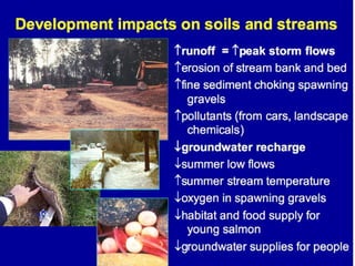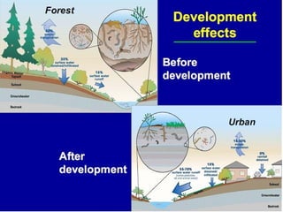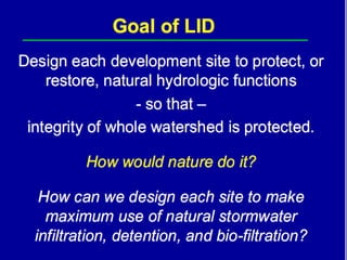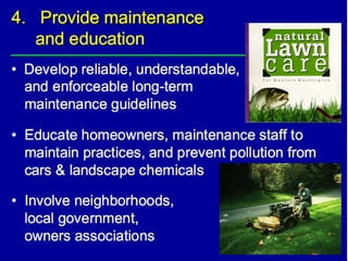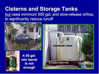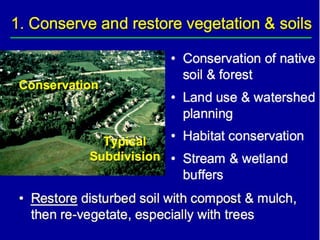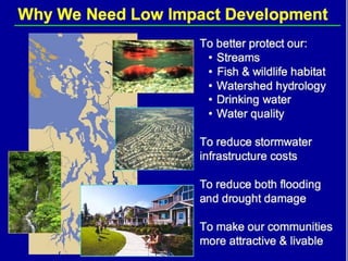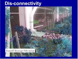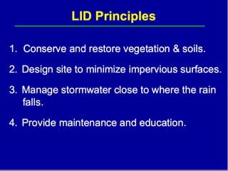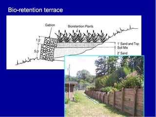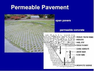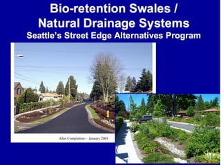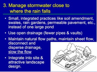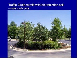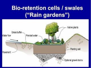 The document outlines the installation of bioretention swales and StormTech chambers in a bioretention area. It includes examples of stormwater management solutions such as green roofs and underground storage. Overall, it focuses on enhancing stormwater management practices.