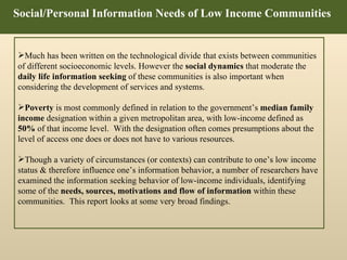 The document discusses the information behaviors and needs of low-income communities. It notes that informal social networks are important sources of information for things like community services, healthcare, education, and employment. Friends, family, and community organizations are often more critical information sources than libraries. The barriers low-income individuals face include lack of access to resources, lack of trust in outside information, and not knowing how to access education and employment opportunities.