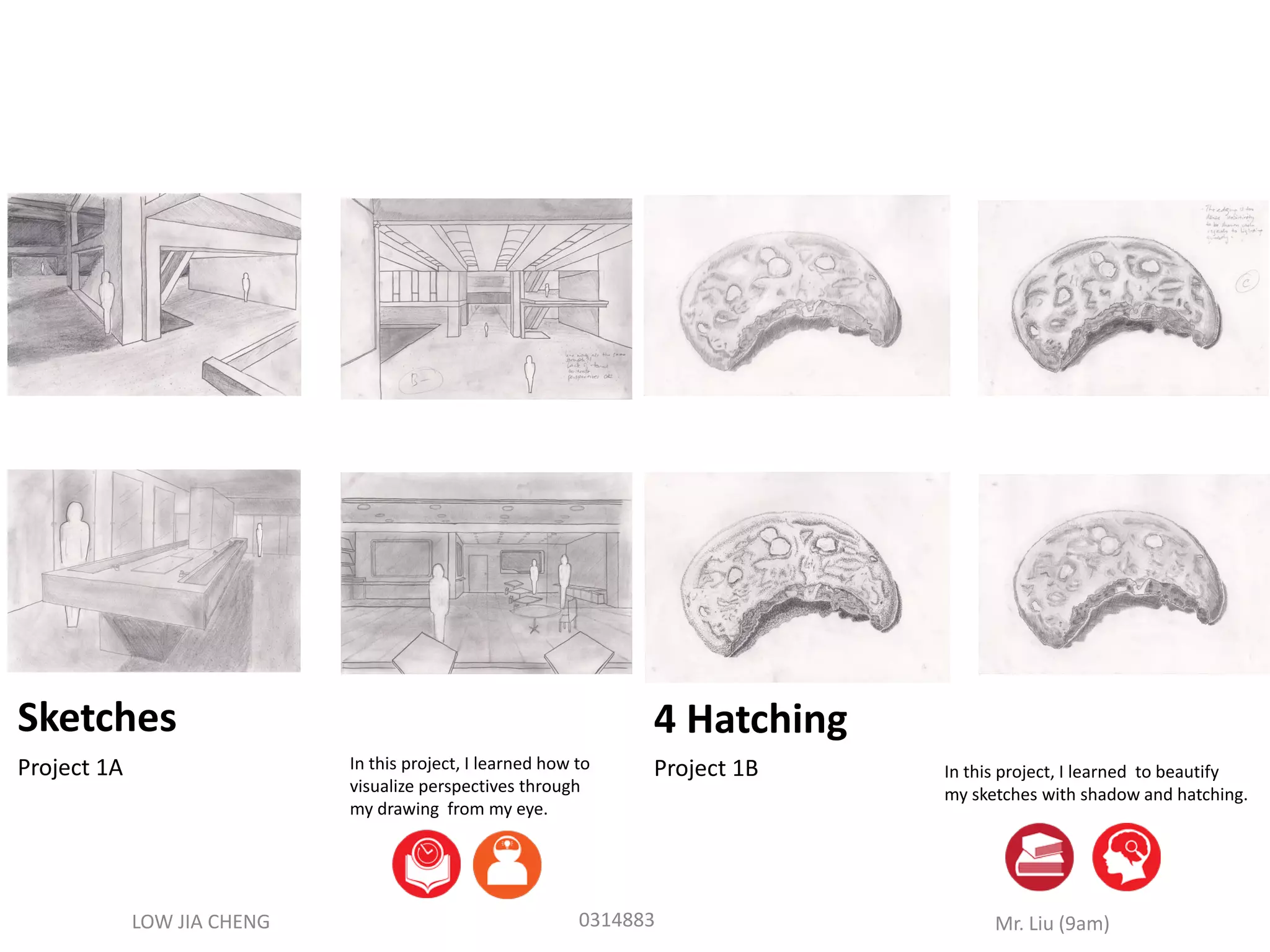 This document contains notes from several design projects. It discusses learning how to visualize perspectives through drawing, learning to add shadow and hatching to sketches to beautify them, learning how to plot and design a comfortable house within limited space and enhance drawings with light weight, learning how to project designs so others can understand them, and learning how to project orthographic drawings into perspective views.